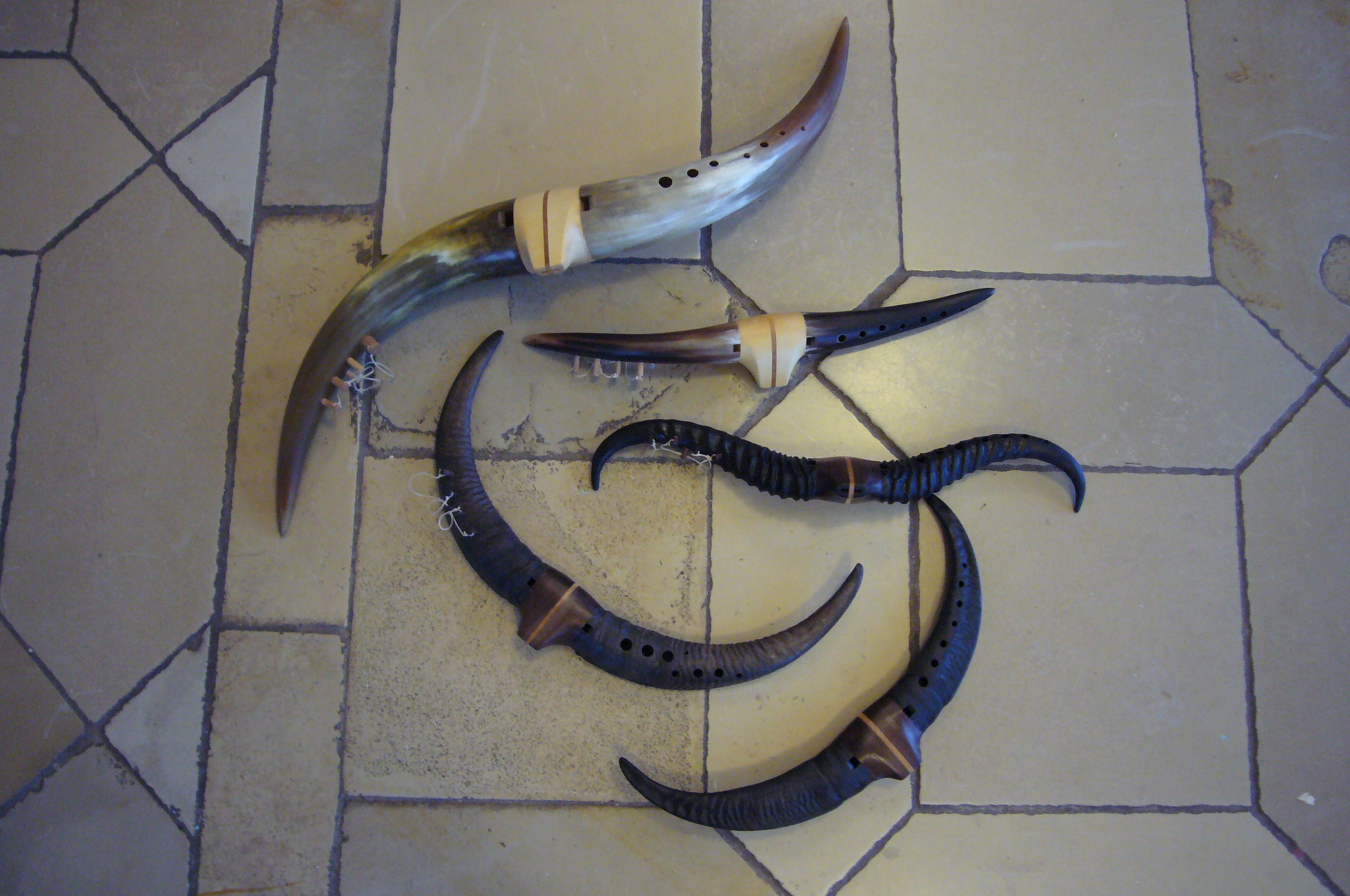 Die Gemshörner aus meinem Sortiment habe ich durch ein wunderschön klingendes Bordungemshorn erweitert. Zwei Gemshörner sind so untereinander verbunden, dass der Spieler zur gegriffenen Flöte parallel einen Grundton (Bordun) als Begleitung hat. Warme, weiche und volltönende Musik wird dadurch möglich.